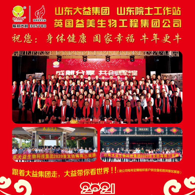最重要的是:這一年,我們要感謝所有的新老客戶,感謝您們選擇了大益集團,是您們用信任與支持給了我們無限的發(fā)展動力,大益生物全體員工祝社會各界領(lǐng)導(dǎo),新老客戶,以及所有支持關(guān)愛公司的社會各界人士在新的2021年里牛年大吉,身體健康,闔家幸福,財源廣進。