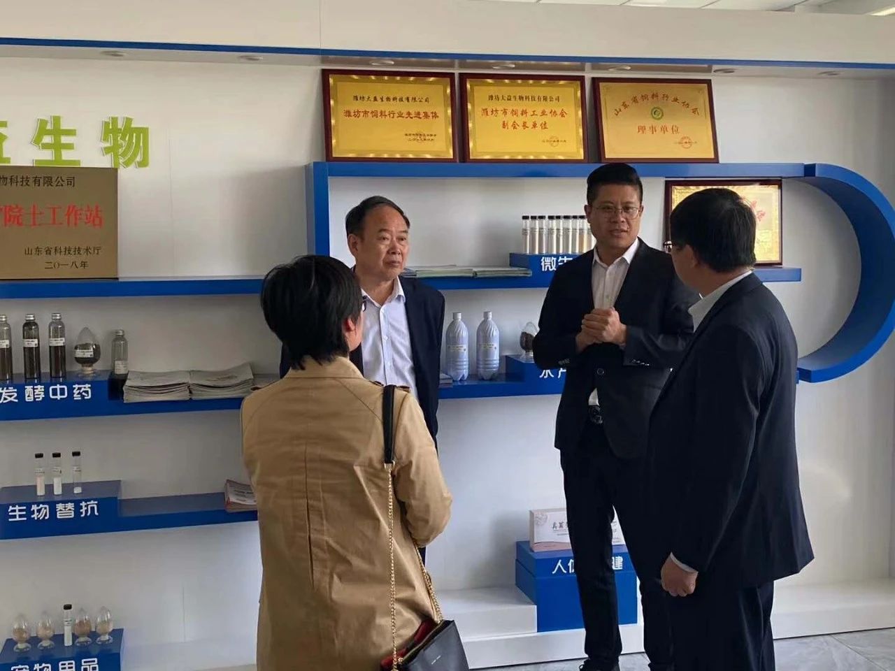在劉總的帶領(lǐng)下,山東畜牧獸醫(yī)學(xué)院專家及領(lǐng)導(dǎo)先從生產(chǎn)車間開始考察參觀,然后是倉(cāng)庫(kù)、發(fā)酵車間、發(fā)酵罐設(shè)備、小料混合間、灌裝間、冷凍干燥間、標(biāo)準(zhǔn)化研發(fā)室、樣品留樣室等等。