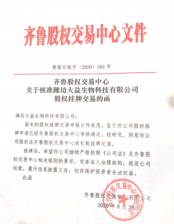 在劉永先董事長和全體員工的共同努力下,濰坊大益生物科技有限公司在齊魯股權(quán)交易中心掛牌上市(股票代碼:305780)這是我公司成立以來的又一重要里程碑。此次掛牌能夠成功不僅需要感謝政府部門的正確指導(dǎo),也有賴于社會各界人士的鼎力支持。
