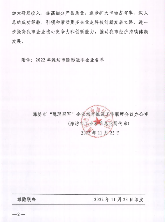 2022年11月23日,濰坊市“隱形冠軍”企業(yè)培育推進(jìn)工作聯(lián)席會(huì)議辦公室發(fā)布《關(guān)于公布2022年濰坊市“隱形冠軍”企業(yè)的通知》,山東大益生物科技集團(tuán)有限公司榮獲“隱形冠軍”企業(yè)的稱(chēng)號(hào)。